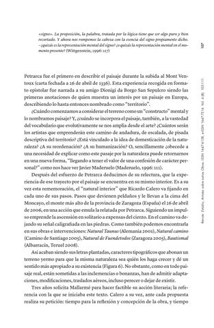 Petrarca fue el primero en describir el paisaje durante la subida al Mont Ventoux (carta fechada a 26 de abril de 1336). Esta experiencia recogida en formato epistolar fue narrada a su amigo Dionigi da Borgo San Sepulcro siendo las primeras anotaciones de quien muestra un interés por un paisaje en Europa, describiendo lo hasta entonces nombrado como “territorio”. ¿Cuándo comenzamos a considerar el terreno como un “constructo” mental y lo nombramos paisaje? Y, ¿cuándo se incorpora el paisaje, también, a la vastedad del vocabulario que evolutivamente se nos amplia desde el arte? ¿Cuántos serán los artistas que emprenderán este camino de andadura, de escalada, de pisada descriptiva del territorio? ¿Está vinculado a la idea de domesticación de la naturaleza? ¿A su reordenación? ¿A su humanización? O, sencillamente ¿obecede a una necesidad de explicar como este pasaje por la naturaleza puede retornarnos en una nueva forma, “llegando a tener el valor de una confesión de carácter personal?” como nos hace ver Javier Maderuelo (Maderuelo, 1996: 111). Después del esfuerzo de Petrarca deducimos de su relectura, que la experiencia de ese trayecto por el paisaje se encuentra en su mismo interior. Es a su vez esta rememoración, el “natural interior” que Ricardo Calero va fijando en cada uno de sus pasos. Pasos que devienen peldaños y le llevan a la cima del Moncayo, el monte más alto de la provincia de Zaragoza (España) el 26 de abril de 2006, en una acción que emula la relatada por Petrarca. Siguiendo un impulso emprende la ascensión en solitario a expensas del cierzo. En el camino va dejando su señal caligrafiada en las piedras. Como también podemos encontrarla en sus obras e intervenciones: Natural Taunus (Alemania 2001), Natural camino (Camino de Santiago 2005), Natural de Fuendetodos (Zaragoza 2005), Bautismal (Albarracín, Teruel 2008). Así acaban siendo sus letras plantadas, caracteres tipográficos que abonan un terreno yermo para que la misma naturaleza sea quién los haga crecer y dé un sentido más apropiado a su existencia (Figura 6). No obstante, como en todo paisaje real, están sometidas a las inclemencias o bonanzas, han de admitir adaptaciones, modificaciones, traslados aéreos, incluso perecer o dejar de existir. Tres años solicita Mallarmé para hacer factible su acción literaria; la referencia con la que se iniciaba este texto. Calero a su vez, ante cada propuesta realiza su petición: tiempo para la reflexión y concepción de la obra, y tiempo