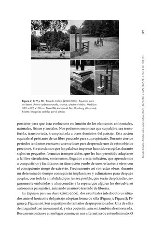 posterior para que ésta evolucione en función de los elementos ambientales, naturales, físicos y sociales. Nos podemos encontrar que su palabra sea transferida, transportada, transplantada a otros dominios del paisaje. Esta acción equivale al préstamo de un libro preciado para su propietario. Durante ciertos períodos tendemos en exceso a ser celosos para desprendernos de estos objetos preciosos. Si recordamos que las palabras impresas han sido recogidas durante siglos en pequeños formatos transportables, que les han permitido adaptarse a la libre circulación, sostenemos, llegados a esta inflexión, que aprendemos a compartirlos y facilitamos su itineración yendo de unos estantes a otros con el consiguiente riesgo de extravío. Precisamente así son estas obras: durante un determinado tiempo conseguirán implantarse y aclimatarse para después aceptar, con toda la amabilidad que les sea posible, que serán desplazadas, seguramente embaladas y almacenadas a la espera que alguien les devuelva su autonomía paisajística, iniciando un nuevo traslado de librería. En Espacios para un deseo (2002-2003), dos eventuales interlocutores situados ante el horizonte del paisaje adoptan forma de silla (Figura 7; Figura 8; Figura 9; Figura 10). Son arquetipos de tamaños desproporcionados. Una de ellas de magnitud casi monumental, y otra pequeña, aun así, también desmesurada. Buscan encontrarse en un lugar común, en una alternativa de entendimiento. O