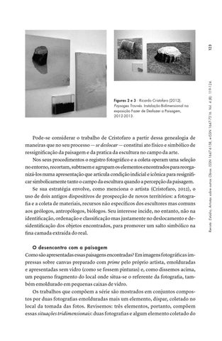 Pode-se considerar o trabalho de Cristofaro a partir dessa genealogia de maneiras que no seu processo — se deslocar — constitui ato físico e simbólico de ressignificação da paisagem e da pratica da escultura no campo da arte. Nos seus procedimentos o registro fotográfico e a coleta operam uma seleção no entorno, recortam, subtraem e agrupam os elementos encontrados para reorganizá-los numa apresentação que articula condição indicial e icônica para resignificar simbolicamente tanto o campo da escultura quando a percepção da paisagem. Se sua estratégia envolve, como menciona o artista (Cristofaro, 2012), o uso de dois antigos dispositivos de prospecção de novos territórios: a fotografia e a coleta de materiais, recursos não específicos dos escultores mas comuns aos geólogos, antropólogos, biólogos. Seu interesse incide, no entanto, não na identificação, ordenação e classificação mas justamente no deslocamento e desidentificação dos objetos encontrados, para promover um salto simbólico na fina camada extraída do real. O desencontro com a paisagem Como são apresentadas essas paisagens encontradas? Em imagens fotográficas impressas sobre canvas preparado com prime pelo próprio artista, emolduradas e apresentadas sem vidro (como se fossem pinturas) e, como dissemos acima, um pequeno fragmento do local onde situa-se o referente da fotografia, também emoldurado em pequenas caixas de vidro. Os trabalhos que compõem a série são mostrados em conjuntos compostos por duas fotografias emolduradas mais um elemento, díspar, coletado no local da tomada das fotos. Revisemos: três elementos, portanto, compõem essas situações tridimensionais: duas fotografias e algum elemento coletado do