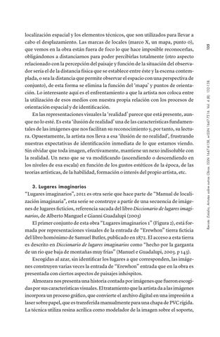 3. Lugares imaginarios “Lugares imaginarios”, 2011 es otra serie que hace parte de “Manual de localización imaginaria”, esta serie se construye a partir de una secuencia de imágenes de lugares ficticios, referencia sacada del libro Diccionario de lugares imaginarios, de Alberto Manguel e Gianni Guadalupi (2003) El primer conjunto de esta obra “Lugares imaginarios 1” (Figura 2), está formada por representaciones visuales de la entrada de “Erewhon” tierra ficticia del libro homónimo de Samuel Butler, publicado en 1872. El acceso a esta tierra es descrito en Diccionario de lugares imaginarios como “hecho por la garganta de un rio que baja de montañas muy frías” (Manuel e Guadalupi, 2003. p 143). Escogidas al azar, sin identificar los lugares a que corresponden, las imágenes construyen varias veces la entrada de “Erewhon” entrada que en la obra es presentada con ciertos aspectos de paisajes inhóspitos. Almozara nos presenta una historia contada por imágenes que fueron escogidas por sus características visuales. El tratamiento que la artista da a las imágenes incorpora un proceso gráfico, que convierte el archivo digital en una impresión a laser sobre papel, que es transferida manualmente para una chapa de PVC rígida. La técnica utiliza resina acrílica como modelador de la imagen sobre el soporte,