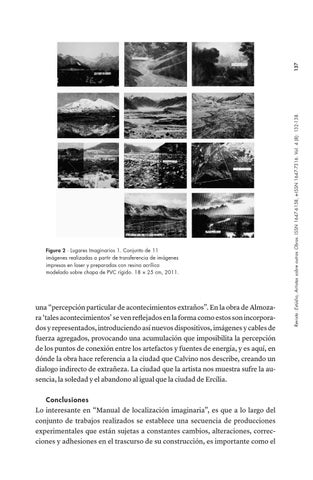una “percepción particular de acontecimientos extraños”. En la obra de Almozara ‘tales acontecimientos’ se ven reflejados en la forma como estos son incorporados y representados, introduciendo así nuevos dispositivos, imágenes y cables de fuerza agregados, provocando una acumulación que imposibilita la percepción de los puntos de conexión entre los artefactos y fuentes de energía, y es aquí, en dónde la obra hace referencia a la ciudad que Calvino nos describe, creando un dialogo indirecto de extrañeza. La ciudad que la artista nos muestra sufre la ausencia, la soledad y el abandono al igual que la ciudad de Ercília. Conclusiones Lo interesante en “Manual de localización imaginaria”, es que a lo largo del conjunto de trabajos realizados se establece una secuencia de producciones experimentales que están sujetas a constantes cambios, alteraciones, correcciones y adhesiones en el trascurso de su construcción, es importante como el