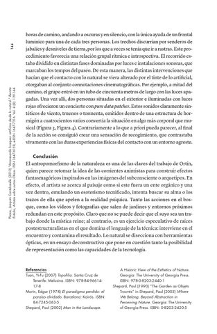 horas de camino, andando a oscuras y en silencio, con la única ayuda de un frontal lumínico para una de cada tres personas. Los trechos discurrían por senderos de jabalíes y desniveles de tierra, por los que a veces se tenía que ir a rastras. Este procedimiento favorecía una relación grupal rítmica e introspectiva. El recorrido estaba dividido en distintas fases dominadas por luces e instalaciones sonoras, que marcaban los tempos del paseo. De esta manera, las distintas intervenciones que hacían que el contacto con lo natural se viera alterado por el tinte de lo artificial, otorgaban al conjunto connotaciones cinematográficas. Por ejemplo, a mitad del camino, el grupo entró en un tubo de cincuenta metros de largo con las luces apagadas. Una vez allí, dos personas situadas en el exterior e iluminadas con luces rojas ofrecieron un concierto con pure data patches. Estos sonidos claramente sintéticos de viento, truenos o tormenta, emitidos dentro de una estructura de hormigón a cuatrocientos vatios convertía la situación en algo más corporal que musical (Figura 3, Figura 4). Contrariamente a lo que a priori pueda parecer, al final de la acción se consiguió crear una sensación de recogimiento, que contrastaba vivamente con las duras experiencias físicas del contacto con un entorno agreste. Conclusión El antropomorfismo de la naturaleza es una de las claves del trabajo de Ortín, quien parece retomar la idea de las corrientes animistas para construir efectos fantasmagóricos inspirados en las imágenes del subconsciente o arquetipos. En efecto, el artista se acerca al paisaje como si este fuera un ente orgánico y una vez dentro, emulando un esoterismo tecnificado, intenta buscar su alma o los trazos de ella que apelen a la realidad psíquica. Tanto las acciones en el bosque, como los vídeos y fotografías que salen de jardines y entornos próximos redundan en este propósito. Claro que no se puede decir que el suyo sea un trabajo donde la mística reine; al contrario, es un ejercicio especulativo de raíces postestructuralistas en el que domina el lenguaje de la técnica: interviene en el encuentro y contamina el resultado. Lo natural se disecciona con herramientas ópticas, en un ensayo deconstructivo que pone en cuestión tanto la posibilidad de representación como las capacidades de la tecnología.