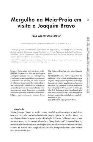 145 Simões, João Luís Antunes (2013) “Mergulho na Meia-Praia em visita a Joaquim Bravo.” Revista :Estúdio, Artistas sobre outras Obras. ISSN 1647-6158, e-ISSN 1647-7316. Vol. 4 (8): 145-153.