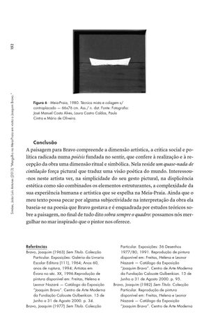 Conclusão A paisagem para Bravo compreende a dimensão artística, a crítica social e política radicada numa poiésis fundada no sentir, que confere à realização e à recepção da obra uma dimensão ritual e simbólica. Nela reside um quase-nada de cintilação força pictural que traduz uma visão poética do mundo. Interessou-nos neste artista ver, na simplicidade do seu gesto pictural, na displicência estética como são combinados os elementos estruturantes, a complexidade da sua experiência humana e artística que se espelha na Meia-Praia. Ainda que o meu texto possa pecar por alguma subjectividade na interpretação da obra ela baseia-se na poesia que Bravo gostava e é enquadrada por estudos teóricos sobre a paisagem, no final de tudo dito sobra sempre o quadro: possamos nós mergulhar no mar inspirado que o pintor nos oferece.