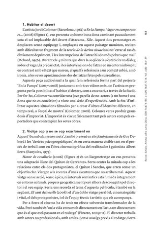 2. Viatge cap a no se sap exactament on Aquest ‘deambular sense meta’, també present en els plantejaments de Guy Debord i les ‘derives psicogeogràfiques’, és en certa manera visible tant en el procés de treball com en l’obra cinematogràfica del realitzador i guionista Albert Serra (Banyoles, 1975). Honor de cavalleria (2006) (Figura 2) és un llargmetratge on ens presenta una adaptació lliure del Quixot de Cervantes. Serra centra la mirada cap a les relacions entre els dos protagonistes, el Quixot i Sancho, que erren sense un objectiu clar. Viatgen a la recerca d’unes aventures que no arriben mai. Aquest viatge sense acció, sense èpica, ni intervals romàntics està filmada íntegrament en entorns naturals, propers geograficament però alhora desconeguts pel director i el seu equip. Serra ens recorda el tema d’aquesta pel·lícula, i també en la següent, El cant dels ocells (2008): el d’un doble viatge paral·lel, cinematogràfic i vital, el dels protagonistes, i el de l’equip tècnic i artístic que els acompanya. Per a Serra el cinema ha de tenir un efecte subversiu transformador de la vida. Però també és ‘on la vida entra molt directament en l’art, tant directament que és el que està passant en el rodatge’ (Pizarro, 2009: 11). El director treballa amb actors no professionals, amb amics. Sense assaigs previs al rodatge, Serra
