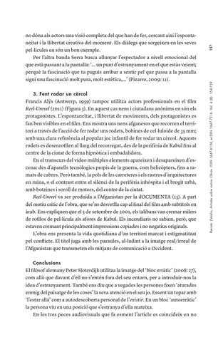 3. Fent rodar un cèrcol Francis Alÿs (Antwerp, 1959) tampoc utilitza actors professionals en el film Reel-Unreel (2011) (Figura 3). En aquest cas nens i ciutadans anònims en són els protagonistes. L’espontaneïtat, i llibertat de moviments, dels protagonistes es fan ben visibles en el film. Ens mostra uns nens afganesos que recorren el territori a través de l’acció de fer rodar uns rodets, bobines de cel·luloide de 35 mm; amb una clara referència al popular joc infantil de fer rodar un cèrcol. Aquests rodets es desenrotllen al llarg del recorregut, des de la perifèria de Kabul fins al centre de la ciutat de forma hipnòtica i embadalidora. En el transcurs del vídeo múltiples elements apareixen i desapareixen d’escena: des d’aparells tecnòlogics propis de la guerra, com helicòpters, fins a ramats de cabres. Però també, la pols de les carreteres i els rastres d’arquitectures en ruïna, o el contrast entre el silenci de la perifèria inhòspita i el brogit urbà, amb botzines i soroll de motors, del centre de la ciutat. Reel-Unreel va ser produïda a l’Afganistan per la dOCUMENTA (13). A part del motiu crític de l’obra, que se’ns desvetlla cap al final del film amb subtítols en àrab. Ens expliquen que el 5 de setembre de 2001, els talibans van cremar milers de rotllos de pel·lícula als afores de Kabul. Els incendiaris no sabien, però, que estaven cremant principalment impressions copiades i no negatius originals. L’obra ens presenta la vida quotidiana d’un territori marcat i estigmatitzat pel conflicte. El títol juga amb les paraules, al·ludint a la imatge real/irreal de l’Afganistan que transmeten els mitjans de comunicació a Occident. Conclusions El filòsof alemany Peter Sloterdijk utilitza la imatge del ‘bloc erràtic’ (2008: 27), com allò que davant d’ell no s’entén fora del seu entorn, per a introduir-nos la idea d’estranyament. També ens diu que a vegades les persones fixen ‘aturades enmig del paisatge de les coses’ la seva atenció en el seu jo. Essent un topar amb ‘l’estar allà’ com a autodescoberta personal de l’existir. En un bloc ‘autoerràtic’ la persona viu en una posició que s’estranya d’ella mateixa. En les tres peces audiovisuals que fa esment l’article es coincideix en no