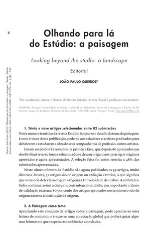 Neste número temático da revista Estúdio lançou-se o desafio do tema da paisagem. Como é mote desta publicação, pede-se aos criadores e artistas graduados para debaterem e estudarem a obra de seus companheiros de profissão, outros artistas. Foram recebidos 82 resumos na primeira fase, que depois de apreciados em double blind review, forma selecionados e deram origem aos 39 artigos originais aprovados e agora apresentados. A seleção feita foi assim restrita a 48% das submissões apresentadas. Neste oitavo número da Estúdio são agora publicados os 39 artigos, muito diversos. Destes, 31 artigos são de origem ou afiliação exterior, o que significa que a maioria deles tem origem exógena à Universidade de Lisboa. A revista Estúdio continua assim a cumprir, com intencionalidade, um importante critério de validação externa: 80 por cento dos artigos aprovados neste número são de origem externa à instituição de origem. 2. A Paisagem como tema
