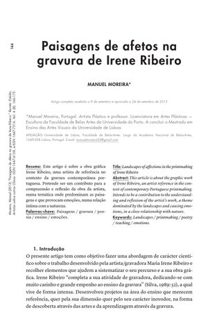 of Irene Ribeiro Abstract: This article is about the graphic work of Irene Ribeiro, an artist reference in the context of contemporary Portuguese printmaking. Intends to be a contribution to the understanding and reflexion of the artist’s work, a theme dominated by the landscapes and causing emotions, in a close relationship with nature. Keywords: Landscapes / printmaking / poetry / teaching / emotions.