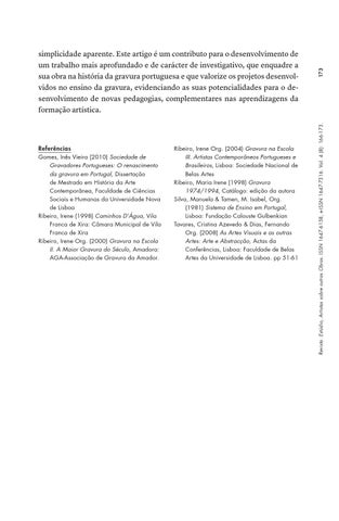 simplicidade aparente. Este artigo é um contributo para o desenvolvimento de um trabalho mais aprofundado e de carácter de investigativo, que enquadre a sua obra na história da gravura portuguesa e que valorize os projetos desenvolvidos no ensino da gravura, evidenciando as suas potencialidades para o desenvolvimento de novas pedagogias, complementares nas aprendizagens da formação artística.