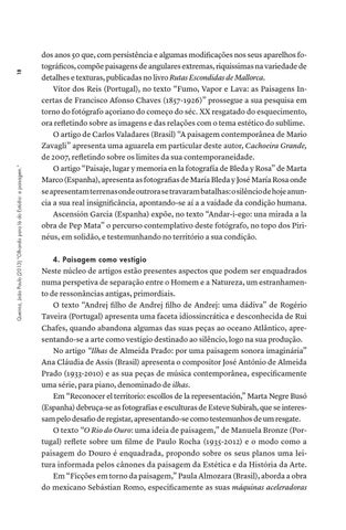 dos anos 50 que, com persistência e algumas modificações nos seus aparelhos fotográficos, compõe paisagens de angulares extremas, riquíssimas na variedade de detalhes e texturas, publicadas no livro Rutas Escondidas de Mallorca. Vítor dos Reis (Portugal), no texto “Fumo, Vapor e Lava: as Paisagens Incertas de Francisco Afonso Chaves (1857-1926)” prossegue a sua pesquisa em torno do fotógrafo açoriano do começo do séc. XX resgatado do esquecimento, ora refletindo sobre as imagens e das relações com o tema estético do sublime. O artigo de Carlos Valadares (Brasil) “A paisagem contemporânea de Mario Zavagli” apresenta uma aguarela em particular deste autor, Cachoeira Grande, de 2007, refletindo sobre os limites da sua contemporaneidade. O artigo “Paisaje, lugar y memoria en la fotografía de Bleda y Rosa” de Marta Marco (Espanha), apresenta as fotografias de María Bleda y José María Rosa onde se apresentam terrenas onde outrora se travaram batalhas: o silêncio de hoje anuncia a sua real insignificância, apontando-se aí a a vaidade da condição humana. Ascensión Garcia (Espanha) expõe, no texto “Andar-i-ego: una mirada a la obra de Pep Mata” o percurso contemplativo deste fotógrafo, no topo dos Pirinéus, em solidão, e testemunhando no território a sua condição. 4. Paisagem como vestígio