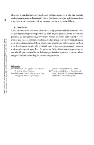 absorver e transformar a novidade sem contudo esquecer a sua rica tradição será, porventura, uma das características que fazem com que a pintura continue a apresentar-se como uma prática plena de pertinência e actualidade. 4. Conclusão À laia de conclusão, podemos dizer que o artigo pretende identificar uma ideia de paisagem num ponto específico da obra de João Jacinto, ponto esse onde a presença da paisagem será, porventura, menos evidente. Pelo caminho, tecemos considerações sobre as possibilidades da pintura contemporânea, abordando a auto-referencialidade bem como a sua abertura ao exterior, mas também o confronto entre o material e o virtual. Num artigo com estas características, é muito mais o que fica por dizer do que o que é dito. Ainda assim, esperamos ter contribuído para outras linhas de investigação sobre a pintura contemporânea em geral e sobre a obra de João Jacinto em particular.