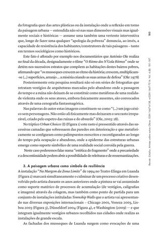 da fotografia quer das artes plásticas ou da instalação onde a reflexão em torno da paisagem urbana — entendida não só nas suas dimensões visuais mas igualmente sociais e históricas — assume uma também uma vertente interventiva que, longe de fazer uma qualquer “apologia da pobreza” denuncia, ao invés, a capacidade de resistência dos habitantes/construtores de tais paisagens − tanto em termos sociológicos como históricos. Este fato é aflorado por exemplo nos documentários que António Ole realiza no final da década, designadamente o filme “O Ritmo dos N’Gola Ritmos” onde se detém nos sucessivos estratos que compõem as habitações destes bairros pobres, afirmando que “os musseques crescem ao ritmo da história; crescem, multiplicam-se (…) superfícies, arranjo … a miséria criando as suas armas de defesa” (Ole: 1978) Posteriormente esta pesquisa resultará não só em séries de fotografias que retratam vestígios de arquiteturas marcadas pelo abandono onde a passagem do tempo e a ruína não deixam de se constituir como metáforas de uma realidade violenta onde os seus atores, embora fisicamente ausentes, são convocados através de uma cenografia fantasmagórica. Nas palavras do autor estas imagens constituem-se como “(…) um jogo cénico sem personagens. Não estão ali fisicamente mas deixaram o seu rasto irreparável, criado pelo espetro das ruinas e do absurdo” (Ole, 2003: 18). No tríptico Urban Choices (I) (Figura 1) este rasto é pressentido através das sucessivas camadas que sobressaem das paredes em deterioração e que metaforicamente se configuram como palimpsestos reescritos e reconfigurados ao longo do tempo pela ocupação e abandono, onde a epiderme das estruturas urbanas emerge como suporte simbólico de uma realidade social corroída pela guerra. Neste caso poderemos falar numa “estética do fragmento” onde a precariedade e a descontinuidade podem abrir a possibilidade de releituras e de ressemantizações.
