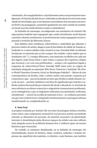 colonizados, dos marginalizados e cuja fisionomia estava em permanente transfiguração. No final da década de 50 e sobretudo na década de 60 será nesta outra cidade de terra batida, que os movimentos nacionalistas irão encontrar um terreno fértil à sua propagação, assumindo igualmente um outro sentido de resistência (neste caso de sentido histórico contra o colonialismo). As fachadas do musseque, reconfiguradas nas instalações de António Ole representam também uma segregação que, sendo inicialmente racial durante o período colonial, transformou-se posteriormente numa segregação social separando o território de diferentes classes. Esta dialética entre resistência, sobrevivência e criatividade que alimenta o processo criativo do artista, alarga-se para lá dos limites da cidade de Luanda estendendo-se a outras cidades onde constrói as suas Township Walls recolhendo localmente os materiais que as irão compor. Na verdade o autor explica que as instalações são “(…) sempre diferentes, com materiais recolhidos em cada um dos lugares onde foram feitas e após visitas a espaços das respetivas cidades que tivessem a ver com essa problemática − sempre a da arquitetura ligada a esquemas de sobrevivência”Estas Township Walls iriam estar na origem da instalação integrada na exposição Who Knows Tomorrow e intitulada The Entire World/Transitory Geometry (2010) no Hamburger Bahnhof — Museu de arte contemporânea em Berlim, onde o artista realiza uma parede composta por contentores e que − para lá da alusão ao muro que dividiu a cidade durante cerca de 29 anos — permite estabelecer um feixe de significados que sintetiza a reflexão estética desenvolvida por António Ole desde a década de 70. Partindo de uma referência aos fluxos comerciais e migratórios transnacionais problematiza as contingências a que os imigrantes enfrentam nas metrópoles ocidentais, relembrando — através da recolha de materiais in loco − as condições precárias em que estes (sobre)vivem e integrando transitoriamente as paisagens urbanas transformando-as, complexificando-as. 4. Nota final