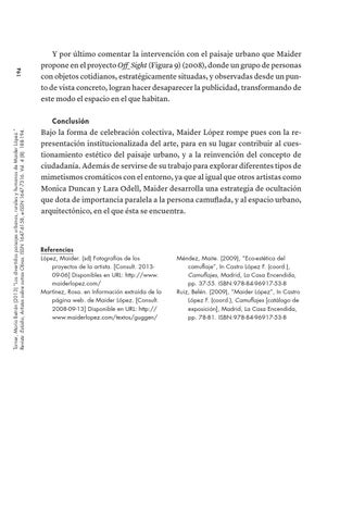 Referencias López, Maider. (sd) Fotografías de los proyectos de la artista. [Consult. 201309-06] Disponibles en URL: http://www. maiderlopez.com/ Martínez, Rosa. en Información extraída de la página web. de Maider López. [Consult. 2008-09-13] Disponible en URL: http:// www.maiderlopez.com/textos/guggen/