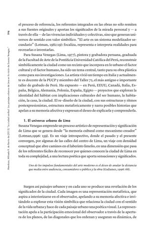 196 Mendoza, Mihaela R. de Barrio de (2013) “La ciudad caníbal: Los paisajes urbanos de Lima en la visión de Susana Venegas.”