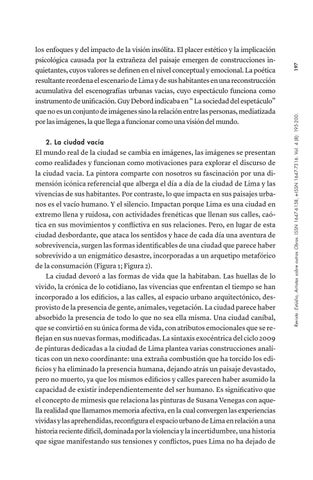 los enfoques y del impacto de la visión insólita. El placer estético y la implicación psicológica causada por la extrañeza del paisaje emergen de construcciones inquietantes, cuyos valores se definen en el nivel conceptual y emocional. La poética resultante reordena el escenario de Lima y de sus habitantes en una reconstrucción acumulativa del escenografías urbanas vacias, cuyo espectáculo funciona como instrumento de unificación. Guy Debord indicaba en “ La sociedad del espetáculo” que no es un conjunto de imágenes sino la relación entre las personas, mediatizada por las imágenes, la que llega a funcionar como una visión del mundo.