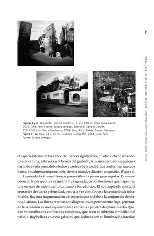 el espacio interno de las calles. De manera significativa, en otro ciclo de obras dedicadas a Lima, esta vez en la técnica del grabado, la misma exclusión se genera a partir de la vista aérea de los techos y azoteas de la ciudad, que conforman una capa densa, visualmente impenetrable, de este mundo solitario y enigmático (Figura 5). La mirada de Susana Venegas parece filtrada por un gran angular. En consecuencia, la perspectiva es inédita y exagerada, con distorsiones que imprimen una especie de movimiento continuo a los edificios. El contrapicado aporta la sensación de fuerza y densidad, pero a la vez contribuye a la sensación de inhabitable. Hay una fragmentación del espacio que se debe a la conjunción de planos distintos. Las líneas rectoras son diagonales, en permanente fuga, generando la sensación de un desplazamiento contenido por otro desplazamiento. Quedan internalizados conflictos y tensiones, que tejen el subtexto simbólico del paisaje. Hay belleza en estos paisajes, que seducen con su iluminación interior,
