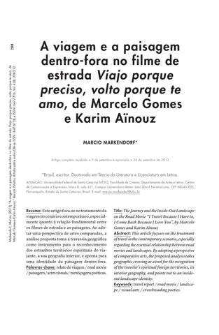 208 Markendorf, Marcio (2013) “A viagem e a paisagem dentro-fora no filme de estrada Viajo porque preciso, volto porque te amo, de Marcelo Gomes e Karim Aïnouz.” Revista :Estúdio, Artistas sobre outras Obras. ISSN 1647-6158, e-ISSN 1647-7316. Vol. 4 (8): 208-212.