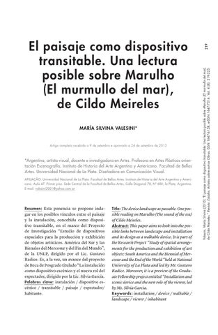 sible reading on Marulho (The sound of the sea) of Cildo Meireles. Abstract: This paper aims to look into the possible links between landscape and installation and its design as a walkable device. It is part of the Research Project “Study of spatial arrangements for the production and exhibition of art objects: South America and the Biennial of Mercosur and the End of the World “held at National University of La Plata and led by Mr. Gustavo Radice. Moreover, it is a preview of the Graduate Fellowship project entitled “Installation and scenic device and the new role of the viewer, led by Ms. Silvia Garcia. Keywords: installation / device / walkable / landscape / viewer / inhabitant
