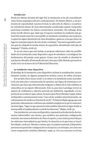 Desde las últimas décadas del siglo XX, la instalación se ha ido consolidando como forma arquetípica del arte contemporáneo. De límites difusos, y sin pretensión de especificidad o pureza formal, la selección de objetos y su particular articulación dentro de unas determinadas coordenadas espacio-temporales parecerían constituir sus únicas características esenciales. Sin embargo, Boris Groys (2008) observa que, dado que el espacio constituye la condición más general del mundo material y perceptible, la instalación manifiesta una tendencia a captar los signos identitarios de otras disciplinas y géneros, a los que ofrece un lugar en su propio espacio; de este modo, constituye “una nueva gramática artística que ha solapado la noción misma de exposición, absorbiendo todo tipo de lenguajes” (Tejeda, 2006: 31) Es en ese marco que este trabajo se propone reflexionar sobre las posibilidades de la instalación como dispositivo capaz de actualizar y reconfigurar los fundamentos del paisaje como género. Como caso de estudio se abordará la instalación Marulho (El murmullo del mar), obra que Cildo Meireles presentó en el año 2007 en el marco de la VI Bienal del Mercosur. La instalación como dispositivo