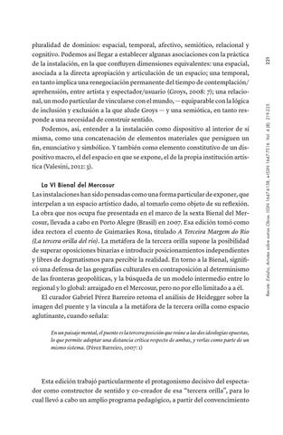 pluralidad de dominios: espacial, temporal, afectivo, semiótico, relacional y cognitivo. Podemos así llegar a establecer algunas asociaciones con la práctica de la instalación, en la que confluyen dimensiones equivalentes: una espacial, asociada a la directa apropiación y articulación de un espacio; una temporal, en tanto implica una renegociación permanente del tiempo de contemplación/ aprehensión, entre artista y espectador/usuario (Groys, 2008: 7); una relacional, un modo particular de vincularse con el mundo, — equiparable con la lógica de inclusión y exclusión a la que alude Groys — y una semiótica, en tanto responde a una necesidad de construir sentido. Podemos, así, entender a la instalación como dispositivo al interior de sí misma, como una concatenación de elementos materiales que persiguen un fin, enunciativo y simbólico. Y también como elemento constitutivo de un dispositivo macro, el del espacio en que se expone, el de la propia institución artística (Valesini, 2012: 3).