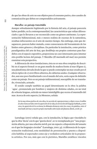 Aunque sobradamente legitimado por la historia del arte, el paisaje parecería haber perdido, en la contemporaneidad, las características que solían diferenciarlo y que lo llevaron a ser reconocido como un género autónomo. La representación bidimensional, más o menos realista de escenas de la naturaleza, resultan infrecuentes en el arte de nuestro tiempo. Sin embargo, más que desaparecer, parecen haber mutado, como consecuencia del borramiento de los límites entre géneros y disciplinas. En particular la instalación, como práctica paradigmática del arte de hoy, que desdibuja sus propios contornos para fundirlos con el espacio expositivo, proporciona un caso interesante para intentar otra posible lectura del paisaje. Y Marulho (El murmullo del mar) nos permite examinar esta perspectiva. A diferencia de otras instalaciones, ésta no es una obra compleja de describir en el aspecto formal: es un gran muelle de madera frente al mar (Figura 1), una plataforma elevada desde la que se puede contemplar un mar creado por el efecto óptico de 17.000 libros abiertos, de cubiertas azules. Cualquier observador, aun uno poco familiarizado con el mundo del arte, sería capaz de definirlo como un paisaje. Pero es un paisaje tridimensional, susceptible de ser transitado, vivenciado, actuado. El sonido cumple también un papel determinante en la obra: la palabra ´agua´, pronunciada por hombres y mujeres de distintas edades, en un total de ochenta lenguas, articula un rumor ininteligible que recrea el murmullo del mar. Acerca de este aspecto, Lu Menezes, señala: En la muy densa poética de esta obra, la sucesión de superposiciones y elipsis evoca el millón de años transcurridos entre la aparición de la vida y la invención del lenguaje hablado, y entre esta y la aparición de la escritura; la dilatada distancia entre las cosas y la palabra, entre el murmullo del mar y nuestro propio murmullo sobre la faz del planeta.(Brett, 2008: 57)
