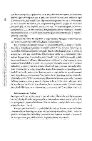 con lo escenográfico, apelando a un espectador visitante que se introduce en ese paisaje y lo completa, con el préstamo circunstancial de su propio cuerpo (Oliveras: 2000, 53). Resulta casi imposible distinguir la obra de la joven sentada en el extremo del muelle, con sus piernas suspendidas (Figura 2), o del niño que corre por allí con su globo rojo. Es que allí, “los cuerpos logran un proceso comunicativo (…). En esta comunicación, el lugar adquiere referencias teatrales al convertirse en un escenario de intercambio para los habitantes que le ocupan”. (Aninat, 2006: 19). De allí la dificultad del registro y la imposibilidad de reproducir la vivencia, que es necesariamente individual, fugaz e intransferible. Por eso otra de las características esencialmente escénicas que posee la instalación la constituye su carácter efímero y único. A este carácter efímero y a la necesidad de tener un receptor concreto, decidiendo el recorrido de la obra y su concepto, es a lo que alude Elena Oliveras para hablar de la instalación como arte de la presencia. Y profundiza este vínculo con lo escénico cuando señala que, en estos casos en los que el espectador penetra en la obra, se produce una suerte de teatralidad reversible: un espectador-visitante ingresa en el espacio del actor y se sumerge en una situación ficcional, que genera un particular efecto de realidad. No se trata en sentido estricto de una acción performática, en la cual el cuerpo del autor-actor deviene soporte material de un acontecimiento; pero si puede parangonarse con “una suerte de performance íntima, intransferible, del receptor” (Oliveras, 2000; 52). De esta manera, un espectador/ usuario habita y construye como escenario el espacio del arte. “Al entrar a formar parte de aquello que ha sido presentado como forma artística, actúa él mismo como arte, desdoblándose entre observador y representación” (Larrañaga, 2001: 45). Consideraciones finales