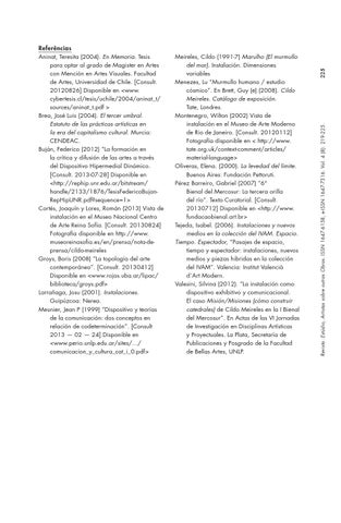 Referências Aninat, Teresita (2004). En Memoria. Tesis para optar al grado de Magister en Artes con Mención en Artes Visuales. Facultad de Artes, Universidad de Chile. [Consult. 20120826] Disponible en <www. cybertesis.cl/tesis/uchile/2004/aninat_t/ sources/aninat_t.pdf > Brea, José Luis (2004). El tercer umbral. Estatuto de las prácticas artísticas en la era del capitalismo cultural. Murcia: CENDEAC. Buján, Federico (2012) “La formación en la crítica y difusión de las artes a través del Dispositivo Hipermedial Dinámico. [Consult. 2013-07-28] Disponible en <http://rephip.unr.edu.ar/bitstream/ handle/2133/1876/TesisFedericoBujanRepHipUNR.pdf?sequence=1> Cortés, Joaquín y Lores, Román (2013) Vista de instalación en el Museo Nacional Centro de Arte Reina Sofía. [Consult. 20130824] Fotografía disponible en http://www. museoreinasofia.es/en/prensa/nota-deprensa/cildo-meireles Groys, Boris (2008) “La topología del arte contemporáneo”. [Consult. 20130412] Disponible en <www.rojas.uba.ar/lipac/ biblioteca/groys.pdf> Larrañaga, Josu (2001). Instalaciones. Guipúzcoa: Nerea. Meunier, Jean P (1999) “Dispositivo y teorías de la comunicación: dos conceptos en relación de codeterminación”. [Consult 2013 — 02 — 24] Disponible en <www.perio.unlp.edu.ar/sites/.../ comunicacion_y_cultura_cat_i_0.pdf>