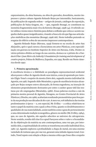 expressionista, da alma humana, na obra do gravador, desenhista, mestre impressor e pintor cubano Agustín Rolando Rojas por intermédio, basicamente, de publicações de segunda ordem — artigos de jornais, catálogos de exposição, publicações de baixa tiragem, etc. — que, segundo Beaugé, se constituem na memória fragmentária mais viva da historia (Beaugé, 1998: 54). O referido autor utiliza o termo micro-história para definir a reflexão que coloca o acento naqueles dados quase insignificantes, visando a busca do elo que liga nas articulações simbólicas das memórias (Beaugé, 1998: 66). Neste trabalho pretende-se resgatar do oblívio a obra de um mestre impressor contemporâneo. Agustín Rolando Rojas (Havana, 1959) formou-se na escola de artes San Alejandro, após o qual cursou a licenciatura em artes Plásticas, com especialização em gravura no Instituto Superior de Artes em Havana, Cuba. Dentre os vários prêmios obtidos ao longo da sua carreira, destaca-se o prêmio de a Fundació Pilar i Joan Miró e da Sothesby’s Foundation for training and development of creative projects, Palma de Mallorca, Espanha, em 1995. Reside em Norte-America desde 1997.