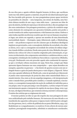 da sua obra para a agonia solitária daquele homem, já idoso, que sacrificara tanto sua vida afetiva quanto a material, em prol de um ideal inalcançável que lhe fora incutido pelo governo. As suas pouquíssimas posses quase invisíveis na penumbra do cômodo — uma lamparina, um retrato de família, uma bicicleta chinesa modelo do ano 1945 e uma rádio russa — parecem nos falar do peso da miséria, da falta de esperança e da inércia do dia-a-dia em qualquer um dos seus conterrâneos. Em paisagens posteriores, o pórtico do cemitério surge como elemento de contraponto aos aposentos fechados, porém sem perder a coesão temática de ambos representarem a vida humana em ruínas. Embora o autor tenha repetido em diversas ocasiões que ele é um ser humano em primeiro lugar, um artista em segundo, e apenas um membro de uma determinada nacionalidade depois — (Eustaquio, 1995), (Isherwood, 1998), e (Maidenberg, 2006) — não podemos esquecer-nos dos cânones que as ditaduras ideológicas impõem nos governados, com o conseqüente definhar da sociedade e da cultura (Llosa, 2012: 129) e a conseguinte necessidade dos artistas de utilizar alegorias visando driblar a ortodoxia. Desde outro ponto de vista, Miskulin cita a pertinência das críticas de Löwy às mazelas originadas pela entronização, no governo revolucionário, dos componentes autoritários e antidemocráticos, com a conseguinte cristalização das tendências burocráticas e repressivas (Miskulin, 2003:36). Desfazendo com este proceder aquele mito continental de esperança que a revolução cubana encarnara em 1959. Nesta fase, sempre que Rojas apresenta figuras humanas nas suas composições — quer sejam desenhos em nanquim, aquarelas ou gravuras — o faz dentro de quartos escuros com um retângulo branco a guisa de janela aberta para o vazio (Figura 7, Figura 8). Talvez esta seja a grande influência de Wyeth nele, como já apontado por Isherwood. A janela como representação do portal da alma entre exterioridade física e o mundo interior. Ora, trata-se de um arquétipo junguiano, o de interpenetração entre o mundo físico, percebido pelos sentidos, e o mundo espiritual, o inconsciente, e a conseguinte transposição da noção de realidade do indivíduo para a sua psique, uma vez que para Jung e seus discípulos, o artista sempre foi tanto um instrumento quanto o interprete do espírito da sua época (Jung, 2005: 254). As suas, são figuras hieráticas, que remetem à doença mental e à desesperança. E muitas das estórias que as originaram são reais. O mesmo poderia ser dito no que diz respeito das suas paisagens da natureza artificializada pelo trabalho humano. No transcurso de uma década a cor translúcida das aquarelas cedeu passo à riqueza tonal e tátil do preto calcográfico das gravuras, isto é, o efeito de polifonia da cor preta (Westheim, 1954: 225). Redefiniram-se o enquadramento e os motivos: O céu coberto de nuvens ameaçadoras, pressagiando tempestades, substituiu os entardeceres ensolarados.