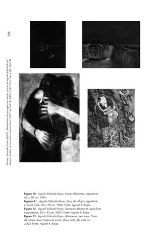 Figura 10 ∙ Agustín Rolando Rojas. Rumos diferentes, mezzotinta, 65 × 50 cm, 1994. Figuras 11 ∙ Agustín Rolando Rojas. Zona de refugio, água-forte e verniz mole, 40 × 50 cm, 1994. Fonte: Agustín R. Rojas. Figura 12 ∙ Agustín Rolando Rojas. Deixa-me abraçar-te, água-forte e ponta-seca, 60 × 45 cm, 2005. Fonte: Agustín R. Rojas. Figura 13 ∙ Agustín Rolando Rojas. Abrace-me, por favor, Prova de artista, duas chapas de zinco, chine collé, 56 × 40 cm, 2000. Fonte: Agustín R. Rojas.
