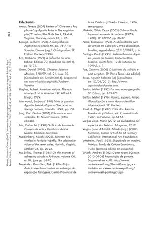 Referências Annas, Teresa (2007) Review of “Give me a hug please” by Agustín Rojas in The virginian pilot/Frisatsun/The Daily Break, Norfolk, Virginia, Thursday, march 15, p. E5. Beaugé, Gilbert (1998). A fotografia na Argentina no século XIX, pp. 48-71 in Samain, Etienne (org.). O fotográfico. SP: Editora Hucitec/CNPQ. Eco, Umberto (1991) A definição de arte. Lisboa: Edições 70, (Reedição de 2011), pp.15-31. Grant, Daniel (1999). Christian Science Monitor, 1/8/99, vol. 91, issue 30. [Consultado em 13/08/2013]. Disponível em <en.wikipidia.org/wiki/Andrew_ Wyeth> Hughes, Robert. American visions. The epic history of art in America. NY: Alfred A. Knopf, 1999. Isherwood, Barbara (1998) Prints of passion. Agustín Rolando Rojas in Que pasa — Spring. Toronto, Canadá, 1998, pp. 7-8. Jung, Carl Gustav (2005) O homem e seus símbolos. RJ: Nova Fronteira, (15ta edição). Luis, Carlos M. (1998).El oficio de la mirada. Ensayos de arte y literatura cubana. Miami: Ediciones Universal, Maidenberg, Micah (2006), Between two worlds in Portfolio Weekly. The alternative voice of the seven cities, Norfolk, Virginia, october 03, pp. 20-22. Mc Evilley, Thomas (1984) On the manner of adressing clouds in ArtForum, volume XXII, no 10, june pp. 61-70. Menéndez González, Aldo (1986) Rojas: Ante la aventura creativa em catálogo da exposição Paisagens, Centro Provincial de