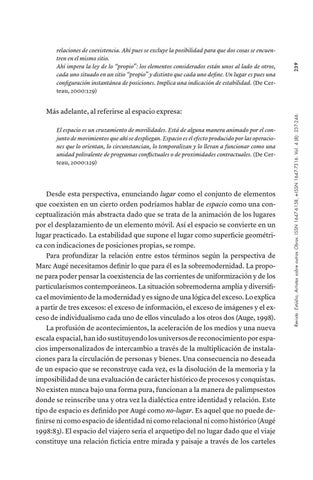 Desde esta perspectiva, enunciando lugar como el conjunto de elementos que coexisten en un cierto orden podríamos hablar de espacio como una conceptualización más abstracta dado que se trata de la animación de los lugares por el desplazamiento de un elemento móvil. Así el espacio se convierte en un lugar practicado. La estabilidad que supone el lugar como superficie geométrica con indicaciones de posiciones propias, se rompe. Para profundizar la relación entre estos términos según la perspectiva de Marc Augé necesitamos definir lo que para él es la sobremodernidad. La propone para poder pensar la coexistencia de las corrientes de uniformización y de los particularismos contemporáneos. La situación sobremoderna amplía y diversifica el movimiento de la modernidad y es signo de una lógica del exceso. Lo explica a partir de tres excesos: el exceso de información, el exceso de imágenes y el exceso de individualismo cada uno de ellos vinculado a los otros dos (Auge, 1998). La profusión de acontecimientos, la aceleración de los medios y una nueva escala espacial, han ido sustituyendo los universos de reconocimiento por espacios impersonalizados de intercambio a través de la multiplicación de instalaciones para la circulación de personas y bienes. Una consecuencia no deseada de un espacio que se reconstruye cada vez, es la disolución de la memoria y la imposibilidad de una evaluación de carácter histórico de procesos y conquistas. No existen nunca bajo una forma pura, funcionan a la manera de palimpsestos donde se reinscribe una y otra vez la dialéctica entre identidad y relación. Este tipo de espacio es definido por Augé como no-lugar. Es aquel que no puede definirse ni como espacio de identidad ni como relacional ni como histórico (Augé 1998:83). El espacio del viajero seria el arquetipo del no lugar dado que el viaje constituye una relación ficticia entre mirada y paisaje a través de los carteles