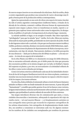 de nuevos mapas insertos en un entramado de relaciones. Red sin arriba, abajo o centro organizador que produce una sensación de vacío o desarraigo muy ligada a buena parte de la producción estética contemporánea. Quien ha representado en una serie de obras esta especie de trama vincular ha sido el artista argentino contemporáneo Guillermo Kuitca. A finales de la década de los ochenta, comenzó a utilizar diversas formas de representación espacial como mapas y planos. Estos se transforman en medio, soporte y argumento para explorar temas universales tales como la migración y la desaparición, lo público y lo privado y la importancia de la relación lugar- memoria. La mirada también es lugar, es un arreglar el mundo. Hay sitios especiales, “privilegiados” para que la mirada “goce”. Arriba. En lo alto. Mirar por encima, abarcando la mayor parte posible, permitiendo un cierto ejercicio de poder. Desde lo alto logramos mirar todo o casi todo. A la par que nos hacemos menos tocables y visibles, podemos controlar, dominar con nuestra mirada (Didi-Huberman, 1997). Las producciones de plantas de departamentos de Kuitca incorporan, necesariamente, este tipo de mirada. Nuevamente aludimos a la doble percepción de una distancia — dada por la abstracción del dibujo en planta — y de una cercanía — la vista de un espacio de la intimidad —. En la obra Planta con SIDA se ve claramente ese juego de doble distancia. Este se encuentra reforzado además, por el doble punto de vista que presenta dos escenarios posibles en la misma imagen: por un lado, la frialdad y lejanía del esquema en planta y, por otro, un acercamiento a la intimidad solitaria de las sillas y cama vacías rodeadas por jeringas. Como si el artista estuviera enhebrando cada una de las intimidades domésticas de las de los hogares familiaresa través de sus vistas en planta, comienza a transitar una necesaria instancia donde se impone un espacio colectivo mayor: el de los mapas y las tramas urbanas. En esta obra, Kuitca delimita el entramado urbano a través de huesos humanos pintados en blanco sobre un fondo texturado de tonos terrosos. A pesar del perfil “humanizante” y sensible que podría aportar el uso de los huesos como vectores, la figura total resultante contrasta tan fuertemente sobre un fondo si se quiere, más orgánico, que profundiza el carácter solitario de una urbe de fríos contornos. Sus mapas introducen diversas vías de comunicación que unen, a veces, ciudades desconocidas e inexistentes, subrayando la experiencia del viaje sin rumbo cierto — tal cual nuestro flâneur — y el desplazamiento anónimo en una cartografía nunca precisa que recuerda los esquemas cartográficos de los artistas situacionistas. Son cartografías de desplazamientos donde ciudades, sus nombres y conexiones se reinventan cada vez. En algunos momentos los nombres de las ciudades son reemplazados por nombres de personas