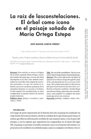253 Perera, José Manuel García (2013) “La raíz de las constelaciones: El árbol como icono en el paisaje soñado de María Ortega Estepa.” Revista :Estúdio, Artistas sobre outras Obras. ISSN 1647-6158, e-ISSN 1647-7316. Vol. 4 (8): 253-258.