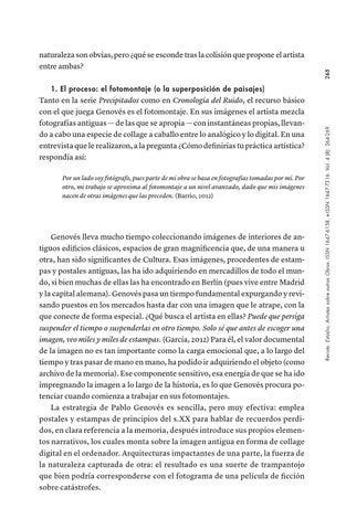 Genovés lleva mucho tiempo coleccionando imágenes de interiores de antiguos edificios clásicos, espacios de gran magnificencia que, de una manera u otra, han sido significantes de Cultura. Esas imágenes, procedentes de estampas y postales antiguas, las ha ido adquiriendo en mercadillos de todo el mundo, si bien muchas de ellas las ha encontrado en Berlín (pues vive entre Madrid y la capital alemana). Genovés pasa un tiempo fundamental expurgando y revisando puestos en los mercados hasta dar con una imagen que le atrape, con la que conecte de forma especial. ¿Qué busca el artista en ellas? Puede que persiga suspender el tiempo o suspenderlas en otro tiempo. Solo sé que antes de escoger una imagen, veo miles y miles de estampas. (García, 2012) Para él, el valor documental de la imagen no es tan importante como la carga emocional que, a lo largo del tiempo y tras pasar de mano en mano, ha podido ir adquiriendo el objeto (como archivo de la memoria). Ese componente sensitivo, esa energía de que se ha ido impregnando la imagen a lo largo de la historia, es lo que Genovés procura potenciar cuando comienza a trabajar en sus fotomontajes. La estrategia de Pablo Genovés es sencilla, pero muy efectiva: emplea postales y estampas de principios del s.XX para hablar de recuerdos perdidos, en clara referencia a la memoria, después introduce sus propios elementos narrativos, los cuales monta sobre la imagen antigua en forma de collage digital en el ordenador. Arquitecturas impactantes de una parte, la fuerza de la naturaleza capturada de otra: el resultado es una suerte de trampantojo que bien podría corresponderse con el fotograma de una película de ficción sobre catástrofes.