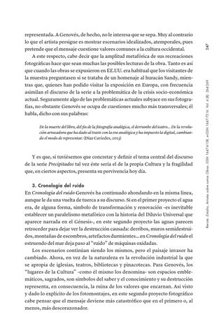 En Cronología del ruido Genovés ha continuado ahondando en la misma línea, aunque le da una vuelta de tuerca a su discurso. Si en el primer proyecto el agua era, de alguna forma, símbolo de transformación y renovación -es inevitable establecer un paralelismo metafórico con la historia del Diluvio Universal que aparece narrada en el Génesis-, en este segundo proyecto las aguas parecen retroceder para dejar ver la destrucción causada: derribos, muros semidestruidos, montañas de escombros, artefactos durmientes… en Cronología del ruido el estruendo del mar deja paso al “ruido” de máquinas oxidadas. Los escenarios continúan siendo los mismos, pero el paisaje invasor ha cambiado. Ahora, en vez de la naturaleza es la revolución industrial la que se apropia de iglesias, teatros, bibliotecas y pinacotecas. Para Genovés, los “lugares de la Cultura” -como él mismo los denomina- son espacios emblemáticos, sagrados, son símbolos del saber y el conocimiento y su destrucción representa, en consecuencia, la ruina de los valores que encarnan. Así visto y dado lo explícito de los fotomontajes, en este segundo proyecto fotográfico cabe pensar que el mensaje deviene más catastrófico que en el primero o, al menos, más descorazonador.