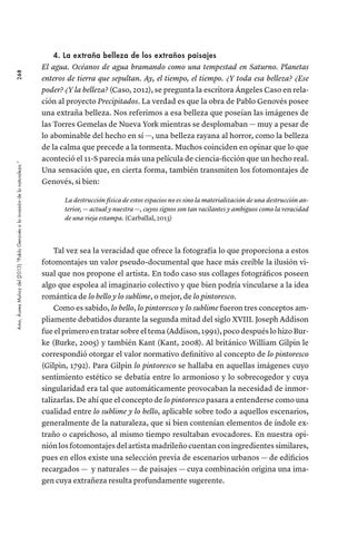 Tal vez sea la veracidad que ofrece la fotografía lo que proporciona a estos fotomontajes un valor pseudo-documental que hace más creíble la ilusión visual que nos propone el artista. En todo caso sus collages fotográficos poseen algo que espolea al imaginario colectivo y que bien podría vincularse a la idea romántica de lo bello y lo sublime, o mejor, de lo pintoresco. Como es sabido, lo bello, lo pintoresco y lo sublime fueron tres conceptos ampliamente debatidos durante la segunda mitad del siglo XVIII. Joseph Addison fue el primero en tratar sobre el tema (Addison, 1991), poco después lo hizo Burke (Burke, 2005) y también Kant (Kant, 2008). Al británico William Gilpin le correspondió otorgar el valor normativo definitivo al concepto de lo pintoresco (Gilpin, 1792). Para Gilpin lo pintoresco se hallaba en aquellas imágenes cuyo sentimiento estético se debatía entre lo armonioso y lo sobrecogedor y cuya singularidad era tal que automáticamente provocaban la necesidad de inmortalizarlas. De ahí que el concepto de lo pintoresco pasara a entenderse como una cualidad entre lo sublime y lo bello, aplicable sobre todo a aquellos escenarios, generalmente de la naturaleza, que si bien contenían elementos de índole extraño o caprichoso, al mismo tiempo resultaban evocadores. En nuestra opinión los fotomontajes del artista madrileño cuentan con ingredientes similares, pues en ellos existe una selección previa de escenarios urbanos — de edificios recargados — y naturales — de paisajes — cuya combinación origina una imagen cuya extrañeza resulta profundamente sugerente.