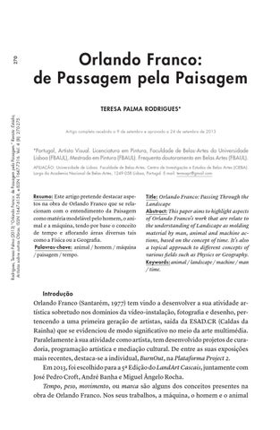 Rodrigues, Teresa Palma (2013) “Orlando Franco: de Passagem pela Paisagem.” Revista :Estúdio, Artistas sobre outras Obras. ISSN 1647-6158, e-ISSN 1647-7316. Vol. 4 (8): 270-275.
