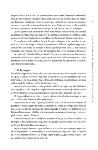 surgem unidos sob a ideia de potencial mecânico. Esse potencial é assinalado através dos efeitos produzidos pela energia criativa do artista aliada ao exercício das forças mecânicas sobre o espaço, por meio do movimento dos corpos, dos seus tempos de ação e/ou inércia, dos seus deslocamentos ou da inscrição dos seus gestos num determinado campo de ação, neste caso, na paisagem. A paisagem é aqui entendida como uma parcela de natureza, um detalhe enquadrado ou recortado no espaço e no tempo, com limites definidos, é uma demarcação ‘num horizonte momentâneo ou duradouro’ (Simmel, 2009: 6). Pretende-se então analisar de que forma a paisagem pode também ser entendida como suporte para a impressão, como uma folha de papel numa gravura, através da ação direta do homem e das máquinas por ele criadas, dos animais (sobretudo dos animais ao serviço do homem) e da própria passagem do tempo. A partir de Untitled (Competition) (Figura 1), tencionamos demonstrar como Orlando Franco pensa a paisagem nos seus limites temporais, como fronteira entre o rural e urbano, entre os resquícios de agricultura e os indícios da industrialização.