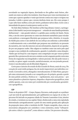 resvalando na vegetação áspera, desviando-se dos galhos mais baixos, alterando seu rumo ao sabor dos instintos. Seus braços por vezes movimentam-se como que a querer apanhar o vento que investe contra seu corpo e revigora sua jornada; é nítido o prazer que o jovem desfruta deste ato. Ele corre porque é o que sabe fazer melhor; corre por inteiro, podíamos talvez dizer. Corre com a intensidade de quem só assim parece sentir-se vivo. No belo filme britânico The loneliness of the long-distance runner, o protagonista Colin Smith é um jovem transgressor — oriundo de uma família proletária disfuncional — cujo grande talento é a aptidão para corridas de fundo. Nesta obra, o ato de correr apresenta-se como um elemento metafórico para veicular com potência a mensagem libertária que perpassa toda a história. A vocação de Smith para correr é um símbolo de seu esforço em enfrentar a adversidade e confrontamento com a autoridade que perpassa sua existência: no presente da narrativa, ele é um dos internos em um reformatório, depois de ser apanhado por um pequeno roubo. Mas afigura-se também como um meio pelo qual escapar a sua condição de confinamento, quando é conduzido a uma situação-limite que irá forçá-lo a um impasse: uma competição em que vencer poderá garantir-lhe a promessa de um novo estatuto social, enquanto perder seria uma forma de resguardar sua integridade e valores pessoais. Ele não pode vencer a corrida, se quiser seguir correndo, metaforicamente, em sua jornada pessoal. Correr é seu derradeiro ato de liberdade (Figura 1). Corte para o interior do estado do Rio Grande do Norte, maio de 2013. No coração do semi-árido potiguar, há, de modo improvável, um indivíduo correndo. Correndo a sério, abnegada e metodicamente. É Túlio Pinto, que propôs uma extenuante jornada a ser cumprida por ele próprio, gerada a partir de uma pulsão artística. Desloca-se — rapidamente, mas sem pressa — por entre planaltos e planícies ásperas, chapadas e depressões geográficas, num asfalto quente, com seu rumo pré-estabelecido por coordenadas geométricas e geográficas.
