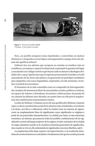 Pero, ¿es posible recuperar zonas deprimidas y convertirlas en núcleos dinámicos e integrados en una lógica autoorganizativa aunque ésta esté alejada del equilibrio urbano? Umberto Eco nos advierte que recuperar no consiste en erradicar sino en restablecer, en mejorar y reparar lo afuncional, respetando lo genuino del lugar y rescatando esos códigos retóricos que hayan caído en desuso e ideologías olvidadas (Eco, 1974). Queda claro que la repuesta proyectual de González es la del saneamiento de las áreas más pobres y la generación de prototipos modulares para adaptarlos a las zonas degradadas, respetando, en todo momento, el modus vivendi de los moradores. El fenómeno de la urbe entendida como un compendio de heterogeneidades, un plano de inmanencia lleno de encrucijadas sociales, políticas y teóricas, un espacio de órdenes y desórdenes, locaciones y dislocaciones, ha pasado de ser, durante las últimas cinco décadas, un asunto clave no sólo para la arquitectura sino también para el pensamiento teórico. La idea de Deleuze y Guattari acerca de una geofilosofía (Deleuze-Guattari 1991), es decir, una filosofía nacida de la relación entre el individuo, el territorio y la tierra, nos lleva a reflexionar sobre la ciudad como un sistema de signos, como un emplazamiento lleno de significantes cuyos significados se originan a partir de sus potenciales interpretaciones. La ciudad, por tanto, es una estructura semántica, un sistema, que proyecta todas las posibles combinaciones de los significados a través del juego recíproco de los signos, el valor semántico de la ciudad no surge solamente cuando se la considera estructura generadora de significados, sino cuando se vive en ella colmándola de significados concretos (Barthes, 1967). La arquitectura debe dejar espacio a la improvisación y a la resolución inmediata de acontecimientos no calculados. Fundamento éste que ha estado presente