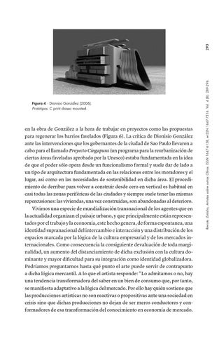 en la obra de González a la hora de trabajar en proyectos como las propuestas para regenerar los barrios favelados (Figura 6). La crítica de Dionisio González ante las intervenciones que los gobernantes de la ciudad de Sao Paulo llevaron a cabo para el llamado Proyecto Cingapura (un programa para la reurbanización de ciertas áreas faveladas aprobado por la Unesco) estaba fundamentada en la idea de que el poder sólo opera desde un funcionalismo formal y suele dar de lado a un tipo de arquitectura fundamentada en las relaciones entre los moradores y el lugar, así como en las necesidades de sostenibilidad en dicha área. El procedimiento de derribar para volver a construir desde cero en vertical es habitual en casi todas las zonas periféricas de las ciudades y siempre suele tener las mismas repercusiones: las viviendas, una vez construidas, son abandonadas al deterioro. Vivimos una especie de mundialización transnacional de los agentes que en la actualidad organizan el paisaje urbano, y que principalmente están representados por el trabajo y la economía, este hecho genera, de forma espontanea, una identidad supranacional del intercambio e interacción y una distribución de los espacios marcada por la lógica de la cultura empresarial y de los mercados internacionales. Como consecuencia la consiguiente devaluación de toda marginalidad, un aumento del distanciamiento de dicha exclusión con la cultura dominante y mayor dificultad para su integración como identidad globalizadora. Podríamos preguntarnos hasta qué punto el arte puede servir de contrapunto a dicha lógica mercantil. A lo que el artista responde: “Lo admitamos o no, hay una tendencia transformadora del saber en un bien de consumo que, por tanto, se manifiesta adaptativo a la lógica del mercado. Por ello hay quién sostiene que las producciones artísticas no son reactivas o propositivas ante una sociedad en crisis sino que dichas producciones no dejan de ser meros conductores y conformadores de esa transformación del conocimiento en economía de mercado.
