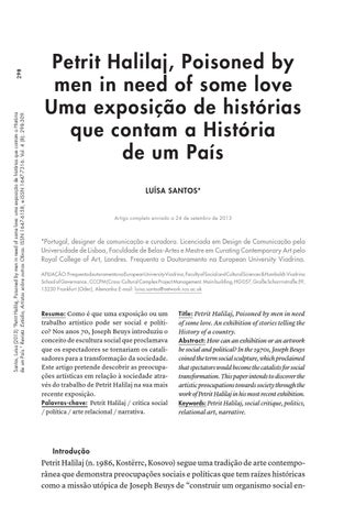 298 Santos, Luísa (2013) “Petrit Halilaj, Poisoned by men in need of some love: uma exposição de histórias que contam a História de um País.” Revista :Estúdio, Artistas sobre outras Obras. ISSN 1647-6158, e-ISSN 1647-7316. Vol. 4 (8): 298-309.