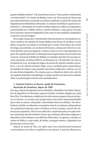 quanto trabalho artístico” e de transformar arte no “único poder evolucionário e revolucionário” (cf. citado em Bishop, 2006: 125). Esta missão de Beuys tem um contexto histórico, enraizado na cultura e ambiente social do Pós-Guerra da Segunda Guerra Mundial na Alemanha. O contexto de Halilaj é a queda do Comunismo e a dissolução do estado Socialista depois de 1989 na ex-Jugoslávia, caracterizados por conflitos étnicos, tensões culturais, e uma guerra civil que levou um país e um povo fragilizados, bem como as suas tradições, instituições e museus a um caos trágico. Este artigo começa por contextualizar historicamente as circunstâncias sociais e políticas do trabalho de Petrit Halilaj como forma de localizar as suas ideias e respostas em relação à sociedade que o rodeia. Estas ideias são o tema do artigo, que pretende, no seu desenvolvimento, começar por observar o contexto histórico das preocupações e criticas sociais na arte contemporânea em geral. De seguida, pretende-se olhar para estas inquietações, de um modo mais concreto, através do trabalho de Halilaj, no exemplo especifico da sua mais recente exposição, no Museu WIELS, em Bruxelas, de 7 de Setembro de 2013 a 5 de Janeiro de 2014. Ao longo do artigo, em termos de método científico, percebe-se o uso do método narrativo (Boje, 2001), escolhido pelas características do trabalho do artista e para permitir uma leitura subjectiva e aberta, em vez de uma leitura dogmática. No entanto, para os objectivos deste texto, não há um capítulo dedicado à metodologia. O artigo conclui com uma breve reflexão sobre o possível papel social da arte contemporânea.