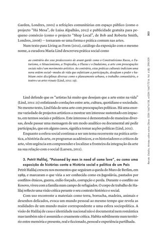 Lind defende que os “artistas há muito que desejam que a arte entre na vida” (Lind, 2011: 21) enfatizando corelações entre arte, cultura, quotidiano e sociedade. No mesmo texto, Lind fala de uma arte com preocupações políticas. Há uma enorme variedade de projectos artísticos a mostrar um interesse sustentado em impacto, em termos sociais e políticos. Este interesse é demonstrado de maneiras diversas, desde passar uma mensagem de um modo analítico ou documental até pedir participação, que em alguns casos, significa tomar acções políticas (Lind, 2011). Enquanto a esfera social continua a ser um tema recorrente na prática artística, a história da arte, os programas académicos, e os historiadores e críticos de arte, vêm urgência em compreender e localizar a fronteira da integração da arte na sua relação com o social (Larsen, 2011). 3. Petrit Halilaj, “Poisoned by men in need of some love”, ou como uma exposição de histórias conta a História social e política de um País