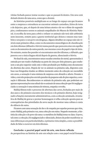 vitrine fechada parece tentar escutar o que se passará lá dentro. Um urso está deitado dentro de uma arca, como que a dormir. As histórias possíveis multiplicam-se ao longo do espaço em que ficamos entre a surpresa e estranheza ao encontrar animais castanhos, feitos de terra e de dejectos, que, só depois de uma leitura atenta e de ver o filme do segundo piso, confirmamos serem os animais empalhados do Museu de História Natural. A escolha da terra para cobrir e refazer os animais não terá sido arbitrária nem inocente, remete para a guerra territorial que deixou o museu mas também o seu país e o seu povo em desgraça. Alguns detalhes no espaço não são visíveis num primeiro olhar, como os documentos museológicos de classificação em dois idiomas (Albanês e Sérvio) numa parede que parecem estar em espelho com os documentos da outra parede, nas mesmas cores de papel e tipo de letra. No entanto, numa das paredes só encontramos um dos idiomas, o Albanês, que passou a ser a única língua oficial depois da guerra, silenciando o Sérvio. No final da sala, encontramos umas escadas estreitas de metal, apresentadas à entrada por um veado e habitadas na parte de cima por dois pássaros, que conduzem a um piso superior onde está o vídeo produzido por Halilaj como documento da abertura das caves. Depois de ver os animais na primeira sala, dispostos com base nas fotografias tiradas ao último momento antes da colecção ser escondida em caves, a sensação é uma mistura de surpresa com absurdo e afecto. Perante o vídeo, com três projecções em três paredes da pequena sala do piso superior, a sensação é diferente. Reconhecemos os animais da primeira sala, que poderiam ser apenas representações mas afinal são os animais de uma colecção que foi negligenciada e a sensação é uma mistura de tristeza, empatia e revolta. Halilaj filmou todo o processo de abertura das caves, fechadas por mais de dez anos e de primeiro encontro dos técnicos e do primeiro diretor, hoje resignado a funções meramente administrativas, com a colecção arruinada. A tentativa de Halilaj de gravar e prestar homenagem à velha colecção aponta para as consequências das prioridades da nova nação de mostrar uma cultura à custa do silêncio de outra. Ficamos com uma sensação de dor e de empatia por aquelas pessoas que vêm, como Halilaj, pela primeira vez, uma colecção em ruína. Naquele momento, a história da colecção e do povo são uma e a metáfora de Halilaj torna-se clara. O povo, tal como a colecção, foi negligenciado e silenciado, deixou de poder manifestar as suas diferenças em particularidades, à primeira vista simples, como a possibilidade de falar e escrever em dois idiomas.