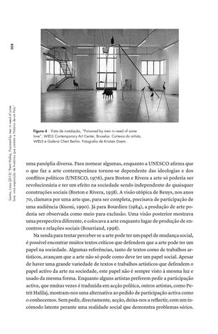 uma panóplia diversa. Para nomear algumas, enquanto a UNESCO afirma que o que faz a arte contemporânea tornou-se dependente das ideologias e dos conflitos políticos (UNESCO, 1976), para Breton e Rivera a arte só poderia ser revolucionária e ter um efeito na sociedade sendo independente de quaisquer construções sociais (Breton e Rivera, 1938). A visão utópica de Beuys, nos anos 70, clamava por uma arte que, para ser completa, precisava de participação de uma audiência (Kuoni, 1990). Já para Bourdieu (1984), a produção de arte poderia ser observada como meio para exclusão. Uma visão posterior mostrava uma perspectiva diferente, e colocava a arte enquanto lugar de produção de encontros e relações sociais (Bourriaud, 1998). Na senda para tentar perceber se a arte pode ter um papel de mudança social, é possível encontrar muitos textos críticos que defendem que a arte pode ter um papel na sociedade. Algumas referências, tanto de textos como de trabalhos artísticos, avançam que a arte não só pode como deve ter um papel social. Apesar de haver uma grande variedade de textos e trabalhos artísticos que defendem o papel activo da arte na sociedade, este papel não é sempre visto à mesma luz e usado da mesma forma. Enquanto alguns artistas preferem pedir a participação activa, que muitas vezes é traduzida em acção política, outros artistas, como Petrit Halilaj, mostram-nos uma alternativa ao pedido de participação activa como o conhecemos. Sem pedir, directamente, acção, deixa-nos a reflectir, com um incómodo latente perante uma realidade social que demonstra problemas sérios.