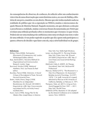 Referências Bishop, Claire (2006). Participation (Documents of Contemporary Art). London: Whitechapel Gallery editions. Boje, David (2001). Narrative Methods for Organizational and Communication Research. London: Sage. Bourriaud, Nicolas (1998). Relational Aesthetics. Paris: Les Presses Du Reel edition Bourdieu, Pierre (1984). Distinction: A Social Critique of the Judgment of Taste. Harvard: Harvard University Press. Breton, André, Rivera, Diego (1938) Manifesto for an Independent Revolutionary Art. [Consult. 20130831] Disponível em <URL: http://www.marxists. org/subject/art/lit_crit/works/rivera/ manifesto.htm> Kuoni, Carin (1990). Energy Plan for the Western Man: Joseph Beuys in America.