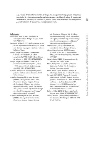 Referências Baudrillard, Jean. (1991) Simulacros e simulação. Lisboa: Relógio D’Água. ISBN 972-708-141-X Benjamin, Walter (1992) A obra de arte na era da sua reprodutibilidade técnica. In “Sobre arte técnica, linguagem e política.” Lisboa: Relógio d’Água. Borges, Jorge Luís (1999a) “Do Rigor em Ciência”, In O Fazedor, In Obras completas II (1952-1972). Lisboa: Círculo de Leitores, p. 223. ISBN 972421897x Borges. Jorge Luis (1999b) “Funes, ou a memória.” In Obras completas I (19231949). Lisboa: Círculo de Leitores, pp. 503-509. ISBN 9724217922 Calvino, Italo (2006) Seis propostas para o próximo milénio. Lisboa: Teorema. ISBN 9726953545 Capelo, Hermenegildo & Ivens, Roberto (1886a) De Angola á Contra-Costa: Descripcao de uma Viagem Atravez do Continente Africano. Vol. I. Lisboa: Imprensa Nacional [Consult. 18 outubro 2013] Disponível em http://archive.org/ download/deangolacontraco01cape/ deangolacontraco01cape.pdf Capelo, Hermenegildo & Ivens, Roberto (1886b) De Angola á Contra-Costa: Descripcao de uma Viagem Atravez